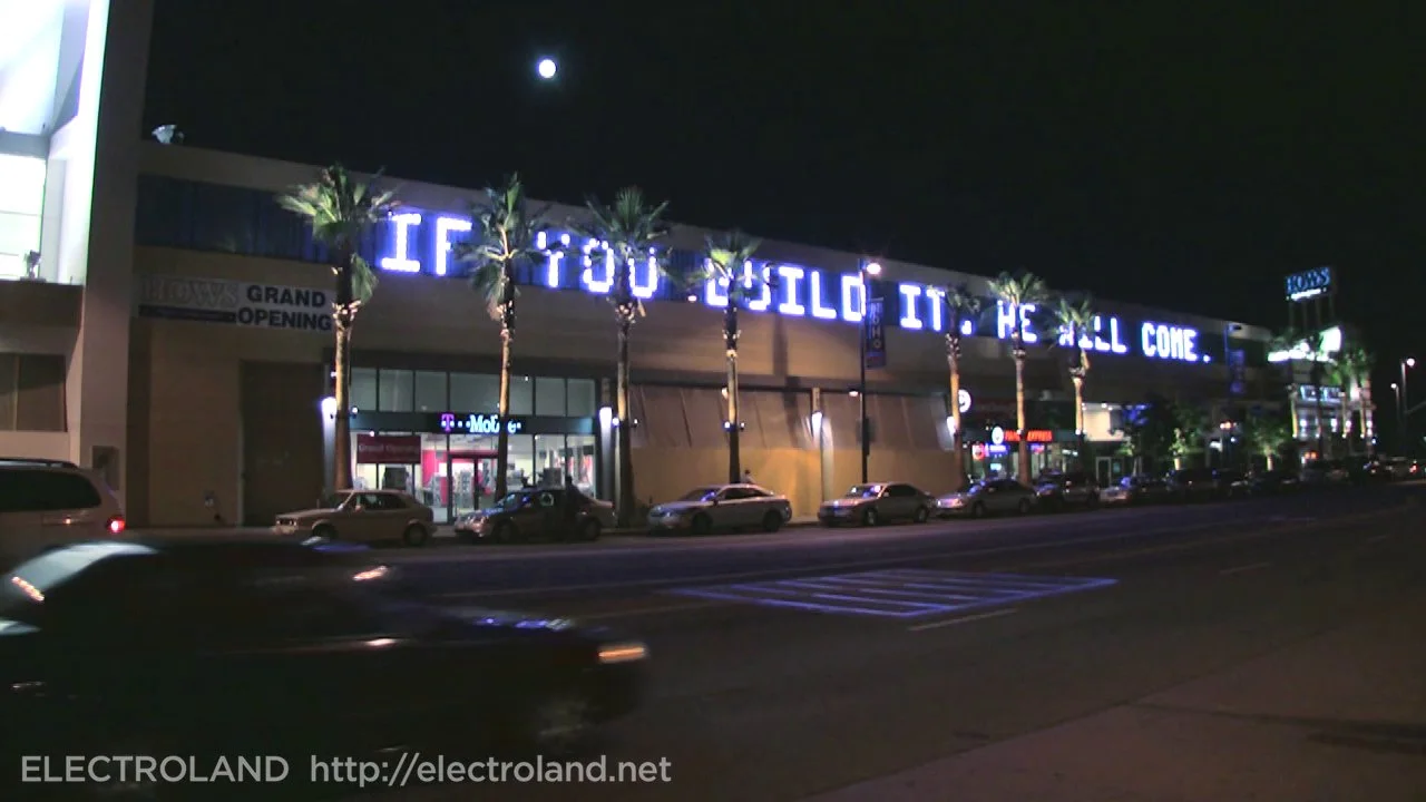 A 73-meter LED interactive light installation tracks passing cars and alternates between two modes: alphanumeric letters that read out famous lines from Hollywood films, and abstract letterforms that follow cars as they pass by, displaying bright red "collisions" as the cars pass each other. 2007.
